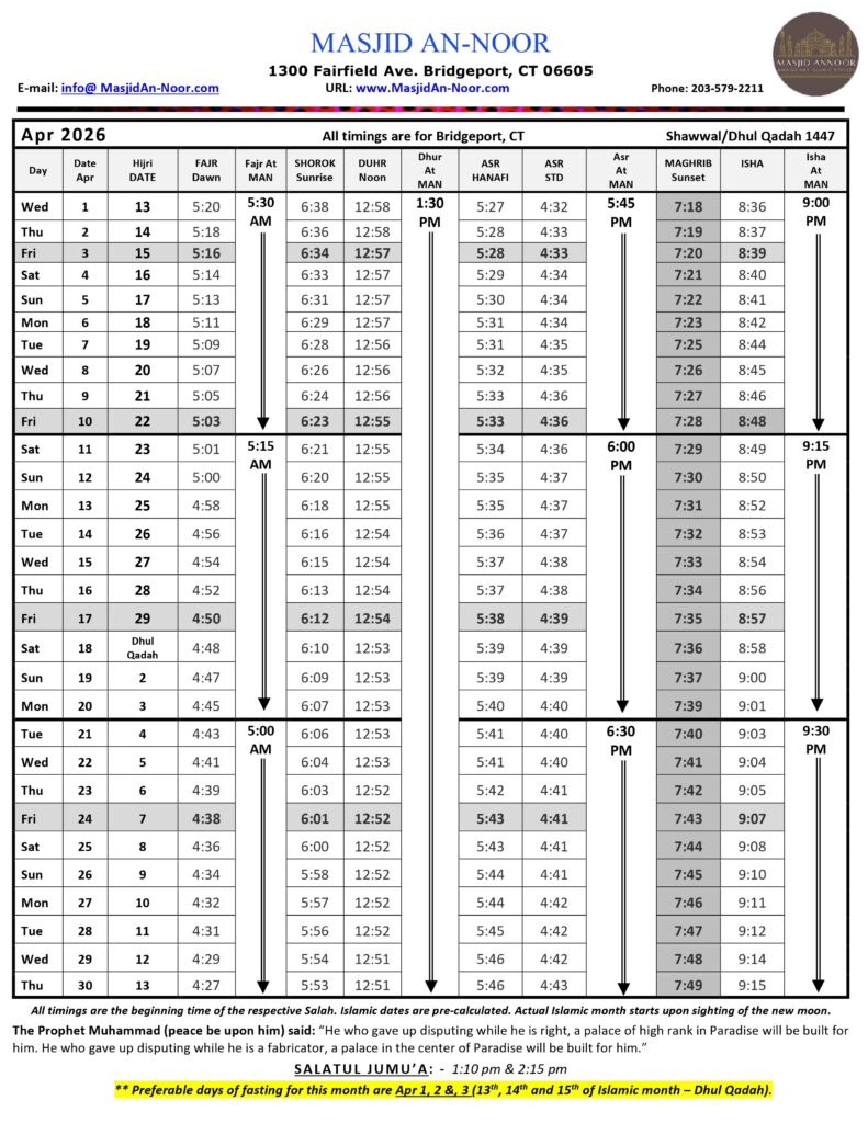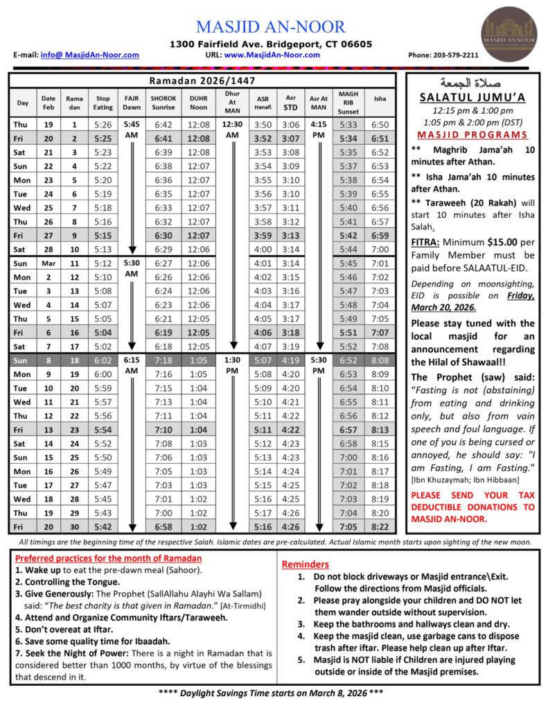 Ramadan is a month of mercy, forgiveness, and transformation. It is a time to renew our faith, increase in prayer, and reconnect with the Qur’an. The Prophet ﷺ said, “Whoever fasts Ramadan with faith and seeking reward, his previous sins will be forgiven.” (Bukhari & Muslim)